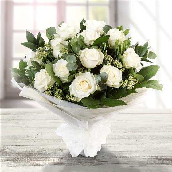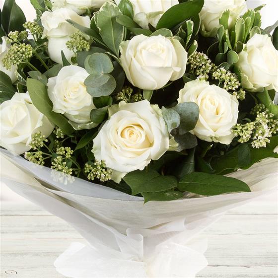 A dozen long stemmed white roses mingled with mixed foliage presented in water.