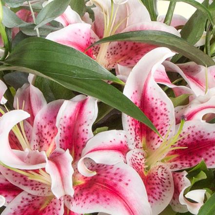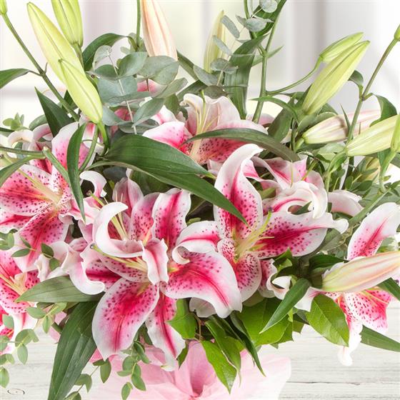 Pink stargazer lilies combined with mixed greenery are all this bouquet needs to make a stunning display of highly perfumed blooms.