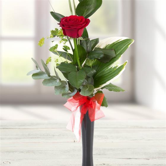 A single long stemmed red rose presented in a vase with mixed foliage sends the message of love.